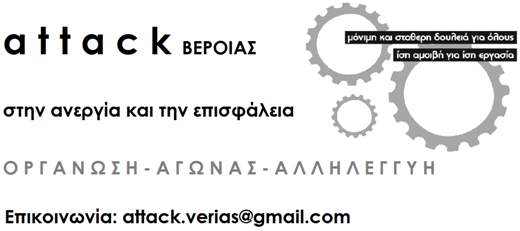 Πάνω σ αυτόν τον εργασιακό μεσαίωνα που στήνει η κυβέρνηση-ΕΕ-Κεφάλαιο αποφασίζουμε να μην μείνουμε με σταυρωμένα τα χέρια και στήνουμε μία πρωτοβουλία που θα παλεύει για ίση αμοιβή για ίση εργασία, με πλήρη εργασιακά δικαιώματα μαζί με όλους τους εργαζόμενους απέναντι στη συνδιαλλαγή, τον ατομικό δρόμο και τον κοινωνικό κανιβαλισμό! Η attackΒΕΡΟΙΑΣ στην ανεργία και την επισφάλεια φιλοδοξεί να δώσει φωνή σε όλο αυτό τον κόσμο που θέλει να σηκώσει κεφάλι και να αμυνθεί απέναντι στην άγρια επίθεση και τρομοκρατία που εξαπολύουν εργοδότες και κυβερνήσεις. Να συμβάλλει έτσι ώστε το εργατικό κίνημα να κάνει δική του υπόθεση το θέμα της ανεργίας και να προσπαθήσει να εκφράσει αυτό το τεράστιο τμήμα της εργατικής τάξης που έχει πεταχτεί εκτός παραγωγής. Να συμβάλλει έτσι ώστε οι διάσπαρτες αντιστάσεις να μετασχηματιστούν σε από τα κάτω προσπάθειες δημιουργίας σωματείων και σχημάτων σε χώρους που αυτά δεν υπάρχουν.